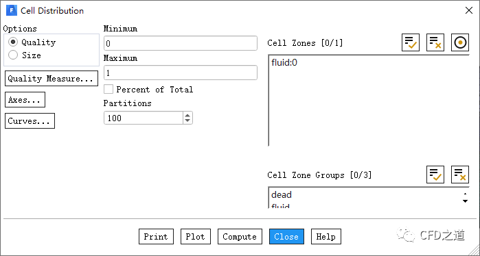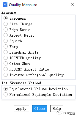 Fluent Meshing中存在众多网格度量指标,可以通过菜单Report > Quality Measure...打开Quality Measure对话框进行查看。其中Fluent Meshing默认采用skewness作为网格度量指标。