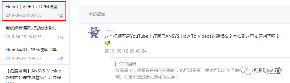 再来说第二个问题。QQ截图显示质疑方比较多的是一个来自油管的ANSYS vof2dpm的视频,但是很奇怪的是,他口口声声说我拿油管视频卖钱,但实质上这个视频从一开始就放在了【Fluent详解案例】里头,而这个系列课程本来是为公众号文章提供视频源的,自始至终就没收过费。刚刚在留言中看到此人留言,我严重怀疑此人没看过文章正文,有兴趣的道友可以点开此文章【文章在这里Fluent|VOF-to-DPM模型】,看看此文是否可以标注原创,如果不能标注原创的话,我可以将其删除。留言的这家伙也是个人才,明明在我的群里头,有疑问不直接找我说,却跑到别人的群里在我背后说,不知道出于什么心态。我很不喜这种行为,男子汉顶天立地,敢作敢为,又不是做贼,没有必要藏头缩尾。