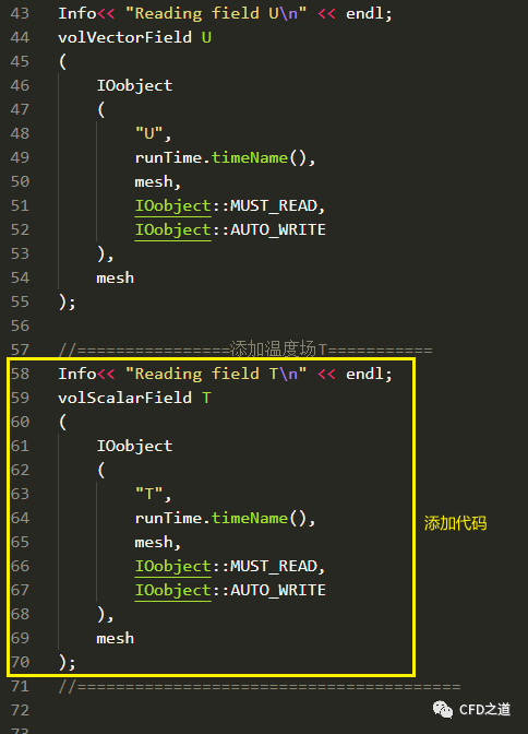 icoFoam求解器本身不具备温度求解功能,这里通过改造求解器源代码使其能够求解温度场。