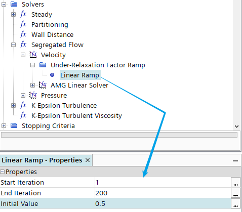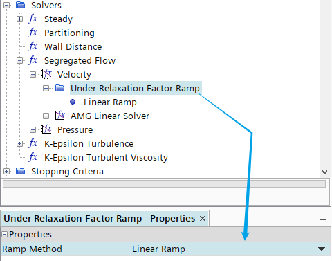 选择模型树节点Solvers > Segregated Flow > Velocity > Under-Relaxation Factor Ramp ,指定 Ramp Method为 Linear Ramp