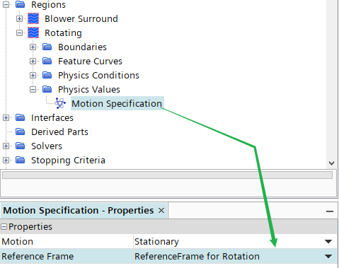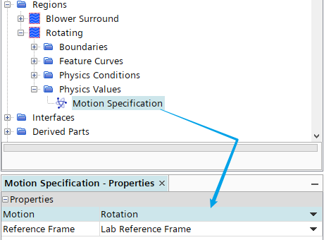 选中节点Regions > Rotating > Physics Values > Motion Specification node,指定 Reference Frame为ReferenceFrame for Rotation