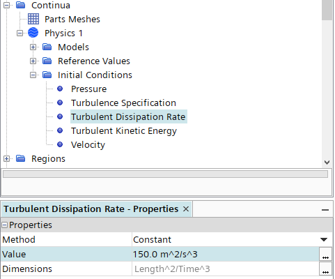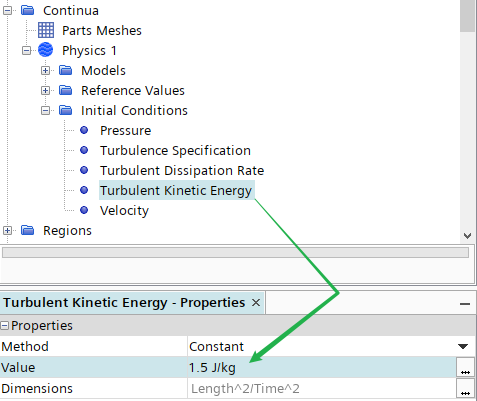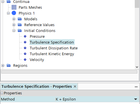 进入模型树节点Continua > Physics 1 > Initial Conditions,如下图所示指定Turbulence Specification为K+Epsilon
