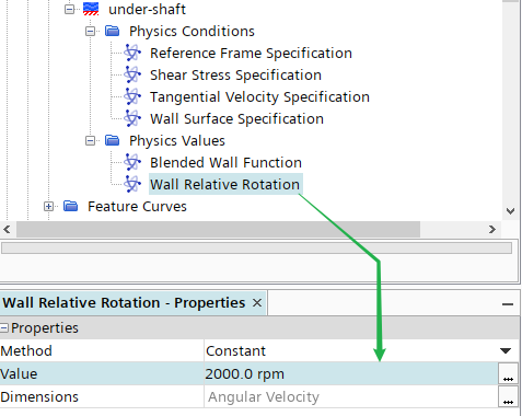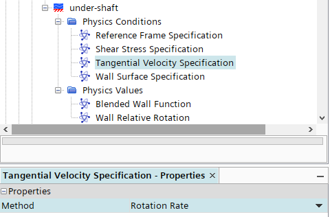 指定节点under-shaft > Physics Conditions > Tangential Velocity Specification的方法为Rotation Rate