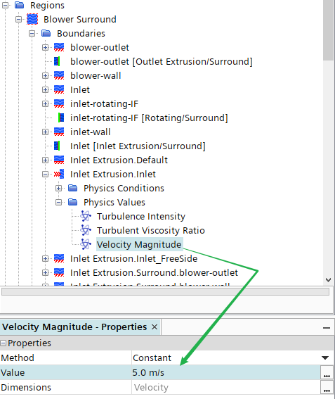 选中模型树节点Regions > Blower Surround > Boundaries > Inlet Extrusion.Inlet,指定入口速度为5 m/s