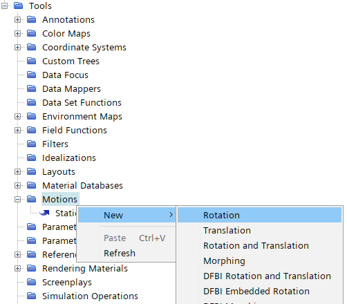 鼠标右键选择模型树节点Motion,点击弹出菜单项New → Rotation