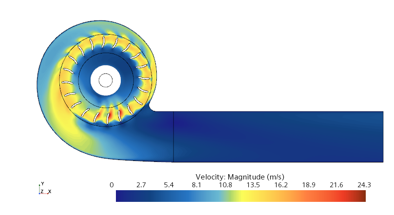 计算几何如下图所示。风扇包含20个等间距的以2000 RPM的速度旋转的叶片,风扇其他部分保持静止。空气以5 m/s的速度从进气口进入到计算区域中,并从出口边界离开。