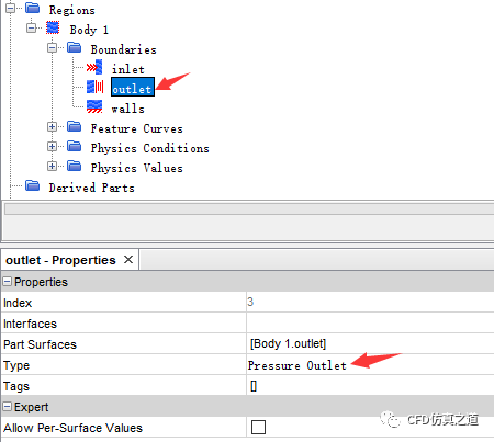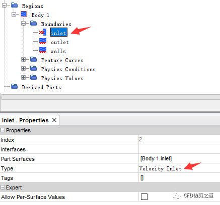 选中模型树节点Regions > Boundaries > inlet,属性窗口中设置Type为Velocity Inlet
