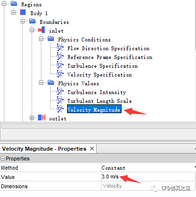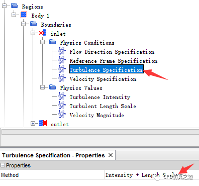选中模型树节点Regions > Body 1 > Boundaries > inlet > Physics Conditions > Turbulence Specification,属性窗口中设置Method为Intensity + Length Scale