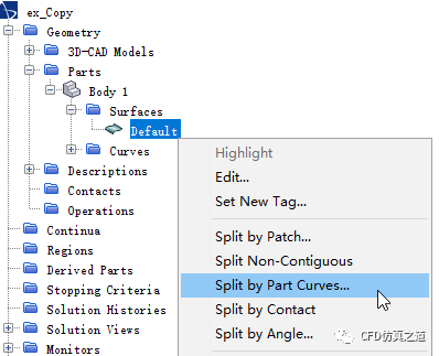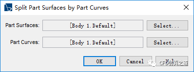 右键选择模型树节点Parts > Body 1 > Surfaces > Default,选择菜单项Split by Part Curves…,利用特征线分割几何