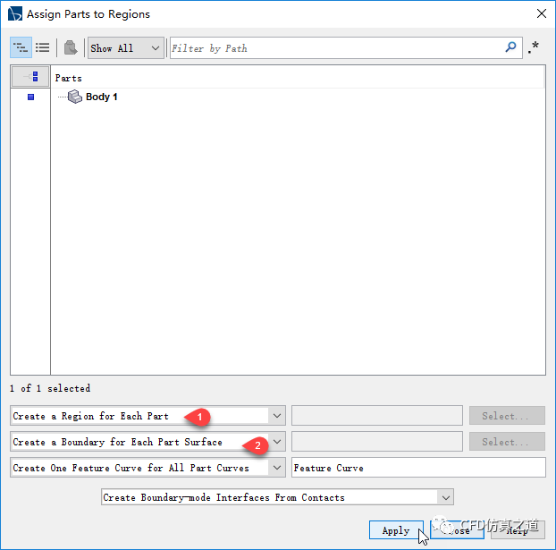选择选项Create a Region for Each Part及Create a Boundary for Each Part Surface,其他参数保持默认设置,点击Apply按钮确认操作