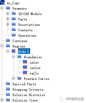 此时点开模型树节点Regions,可以看到里面多了一个名为Body 1的子节点,下属Boundaries节点中包含上面定义的各个边界名。