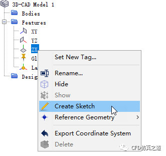 右键选择模型树节点Features > ZX,选择弹出菜单项Create Sketch,在ZX面上创建草图
