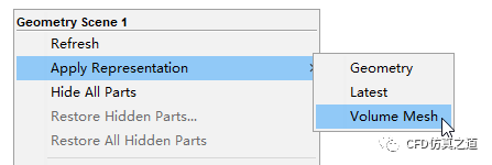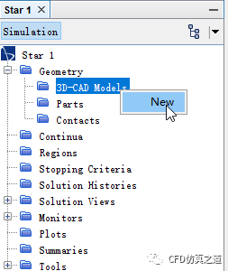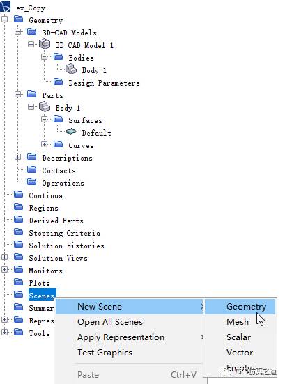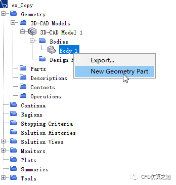仿真模块中,右键选择模型树节点Geometry > 3D-CAD Models > 3D-CAD Model 1 > Bodies > Body 1,选择菜单项New Geometry Part加载创建的几何