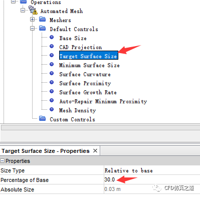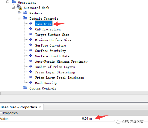 点击模型树节点Operations > Automated Mesh > Default Controls > Base Size,属性窗口中设置Value为0.01 m