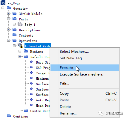 右键选择节点Automated Mesh,选择菜单项Execute重新生成网格