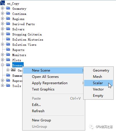 右键选择节点Scenes,选择右键菜单New Scenes > Scalar,此时在Scalar Scene 1下增加了新的节点Scalar 1