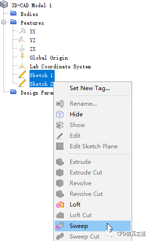 建模模块中同时选择sketch 2及sketch 1,点击鼠标右键,选择菜单项Sweep,在弹出的设置面板中点击OK按钮生成3D几何