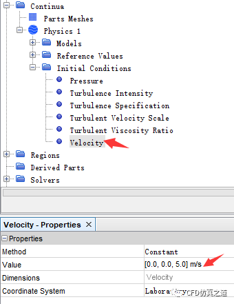 选择节点Continua > Initial Conditions > Velocity,设置Value为[0,0,5] m/s