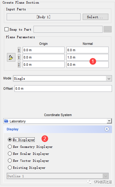 弹出的剖切面定义面板中,定义Origin为[0 0 0],定义Normal为[0 1 0],选择No Displayer,点击Create按钮创建剖切面