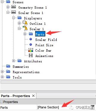 选中节点Scalar 1 > Parts,在属性窗口中设置Parts为上一步创建的Plane Section