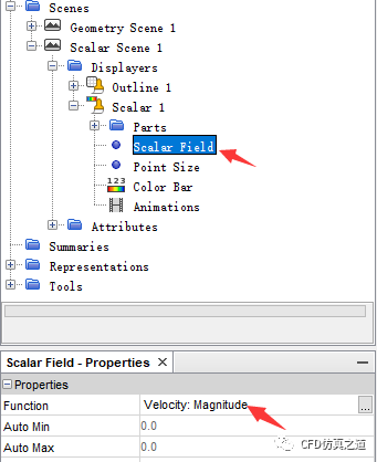 选中节点Scalar 1 > Scalar Field,在属性窗口中设置Functions为Velocity:Magnitude