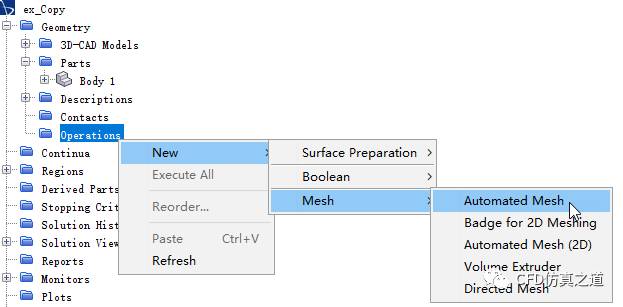 右键选择模型树节点Geometry > Operations,选择弹出菜单New → Mesh → Automated Mesh弹出网格设置向导