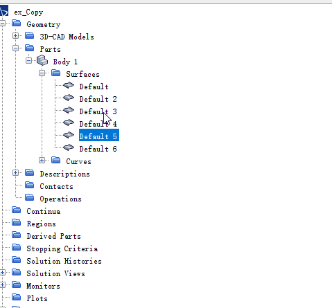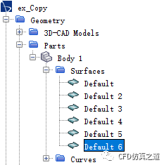 几何加载后只有一个名为Default的面(位于节点Parts > Body 1 > Surfaces > Default),需要将其分解,以方便后期边界条件设置。