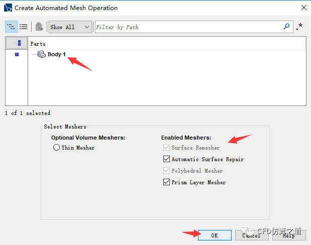 在向导对话框中,选择Parts为Body 1,选择网格生成选项包括Surface Remesher、Automatic Surface Repair、Polyhedral Mesher及Prism Layer Mesher,点击OK按钮确认操作