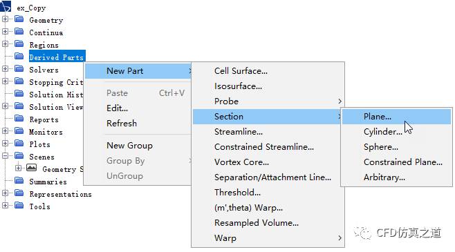 右键选择节点Derived Part,选择右键菜单New Part > Section > Plane…弹出剖切面定义面板