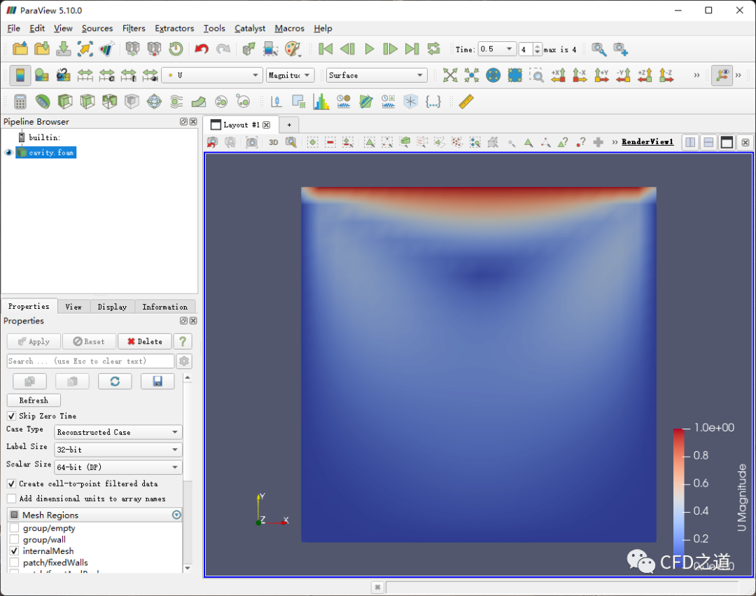 这样在案例根路径下输入命令paraFoam即可打开paraFoam并自动加载案例文件。此种方式无需安装和配置xming。