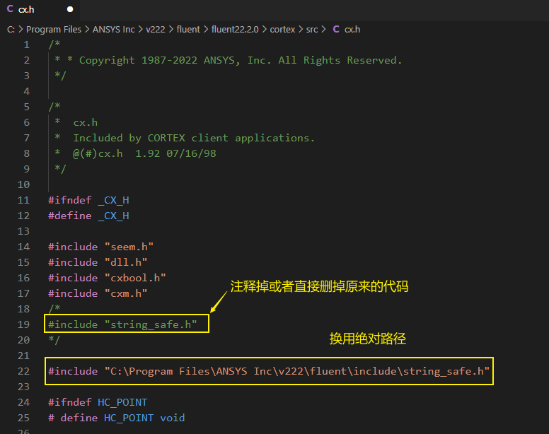 C:Program FilesANSYS Incv222fluentfluent22.2.0cortexsrccx.h(18): fatal error C1083: 无法打开包括文件: “string_safe.h”: No such file or directory