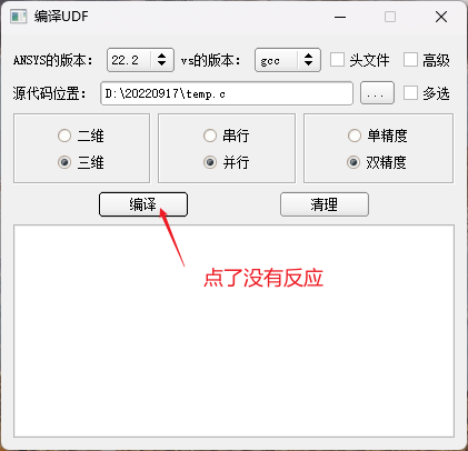 问题是换用Fluent2022版本后,使用gcc编译不了UDF,就是点击下图中的编译按钮不起作用。但是换用2022R1又是能够正常编译的,目前不知问题在哪里。因为没有源代码,所以就无能为力了,只能寄希望于硫酸大神有空瞅瞅了。或者哪天等我有空了,再自己搞一个新的。