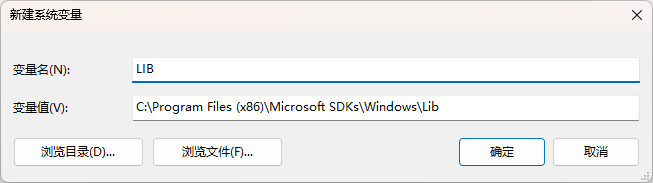 新建环境变量LIB,指定变量值为 C:Program Files (x86)Windows Kits10Lib(注意,不同的电脑路径可能有所差异),如下图所示。