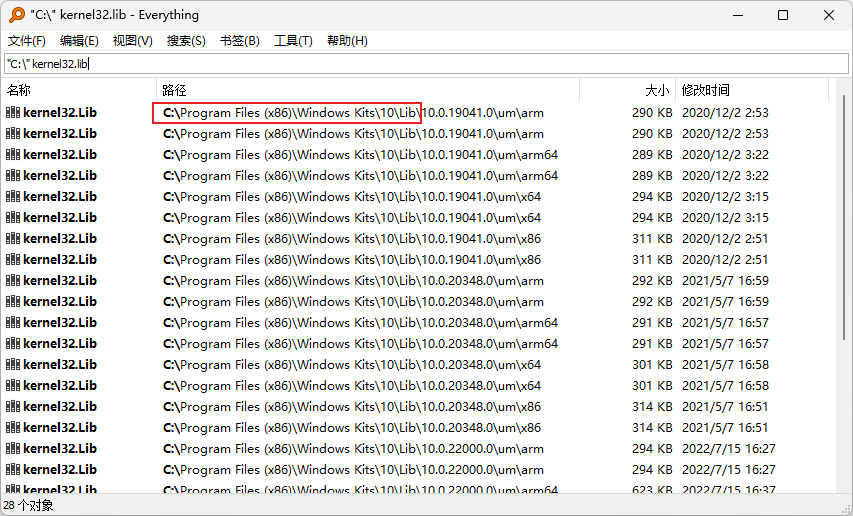 从错误源头上找文章,貌似是 kernel32.lib文件有问题,前面是乱码,也不知到底是什么问题。猜测可能是找不到此文件。在电脑中搜索文件kernel32.lib,这里找到了此文件,看起来似乎不是缺少文件,而是没有找到文件。记住此文件所在的路径。