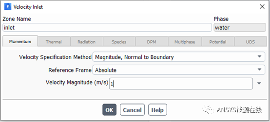 7.设置入口边界条件,将入口是水速度设置为1m/s