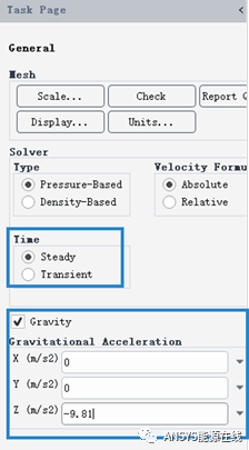 1.读入网格,选择稳态计算(默认即稳态),设置重力加速度