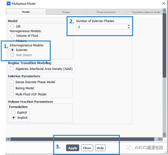 5.设置多相流模型。在multiphase下激活Eulerian模型,保证number of Euler Phases下的数值为2,点击apply