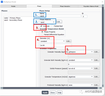 将Secondary Phase名字改为sand,并在Phase Material里面选择sand, 勾选上Granular,采用颗粒动理论计算颗粒的粘度。将沙粒的直径设置成1e-4米,选择gidaspow模型计算Granular Viscosity,最后点击apply