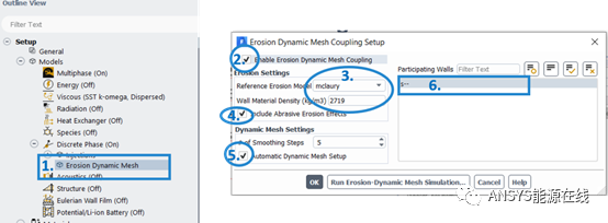 14. 在Outline View下找到Discrete Phase(On),点击下面的Erosion Dynamic Mesh,在弹出的窗口上勾选Enable Erosion Dynamic Mesh Coupling,在Reference Erosion Model下面选择mclaury,设置壁面材料密度,默认值为铝的密度2719kg/m3。勾选上include Abrasive Erosion Effects以及Automatic Dynamic Mesh Setup,在Participating Wall下面勾选上对应壁面,点击下面的Run Erosion-Dynamic Mesh Simulation