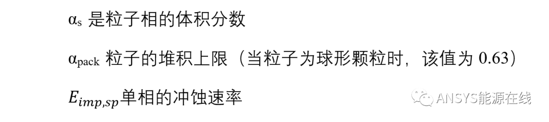 对于稀相体系而言冲蚀主要是由粒子对壁面的动量碰撞造成的,墙壁附近的粒子不会受其它粒子的影响。而对于密相体系而言,除了上述因素之外,还需要考虑粒子与粒子之间的相互作用,当颗粒紧贴壁面时,会对壁面起保护作用(wall shielding);当粒子紧紧贴在固体壁面平行运动时,会对壁面产生磨蚀(abrasive erosion)。在Fluent中,密相系统的冲蚀速率计算公式为: