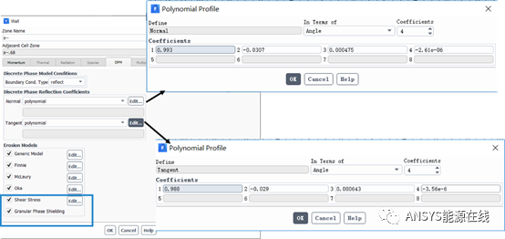 13. 此时打开壁面边界条件,可以看出现在壁面多了两个选项,shear stress以及Granular phase Shielding模型,将所有模型全部勾选上,并设置Discrete Phase Reflection Coefficients