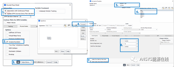 11. 选择Discrete Phase Model,勾选上Interaction with Continuous Phase和update DPM Sources Every Flow Iteraton,在Physical Models里面激活Erosion/Accretion,点击Injections,在弹出的窗口中点击Create,弹出新的窗口。在新弹出的窗口Injection Type下面选着surface,并在Release From Surfaces下面选择inlet。随后在左下角勾选上Inject Using Face Normal Direction,并在窗口内设置速颗粒直径,速度和流量。