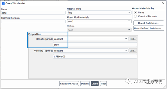 4.创建沙子材料物性,将沙子密度设置为2400kg/m3