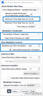 15. 点击Run Erosion-Dynamic Mesh Simulation, 设置最小时间步长,以及最终所需计算的物理时间,勾选上Solve DPM during Flow Simulation, 点击最底部的Run,