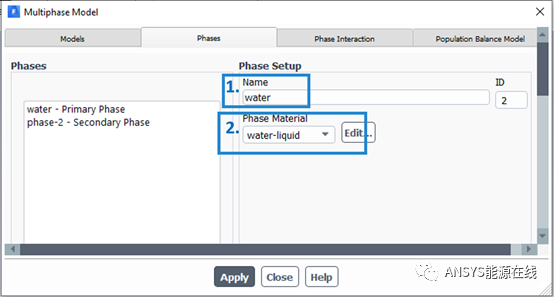 将primary phase名字改为water,并在Phase Material里面选择water-liquid。