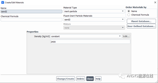 12. 需要指出采用DPM模型注入的粒子为inert-particle,默认的材质为anthracite, 在计算碰撞冲蚀时需要用到粒子的密度,因此必须将anthracite密度改成与沙子一致的密度,本案例中,将anthracite改名为sand2