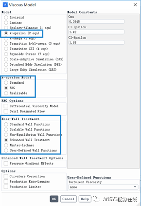 2.湍流模型选择RNG k-ε湍流模型,在Near-Wall Treatment下激活 Enhanced Wall Treatment