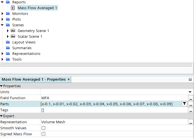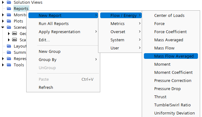 右键选择模型树节点 Reports,点击弹出菜单项New Report → Flow/Energy → Mass Flow Averaged 创建报告