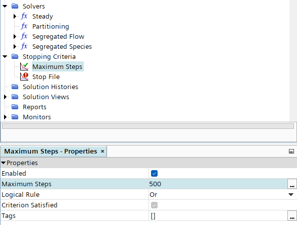 鼠标选中模型树节点Stoping Criteria,属性窗口设置Maximum Steps为500