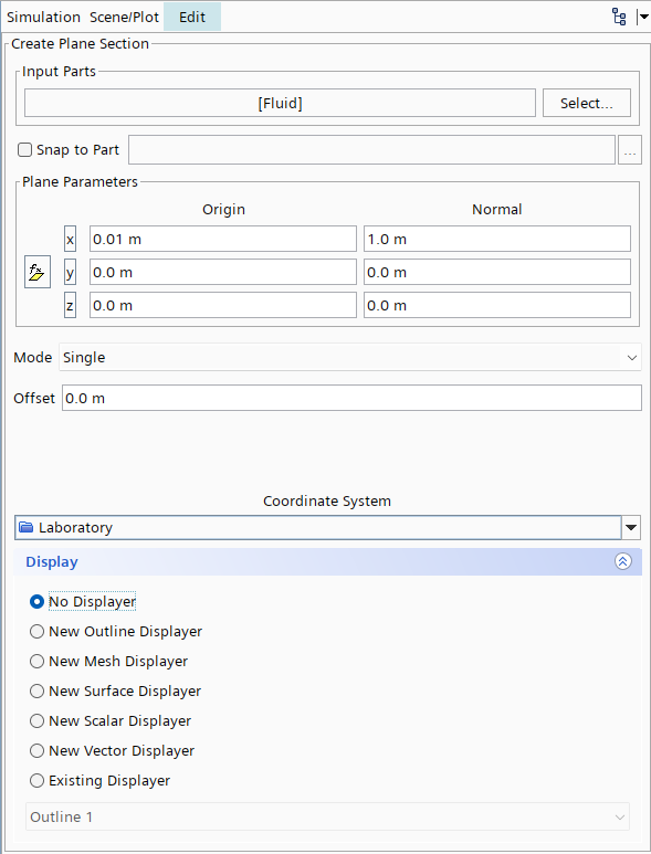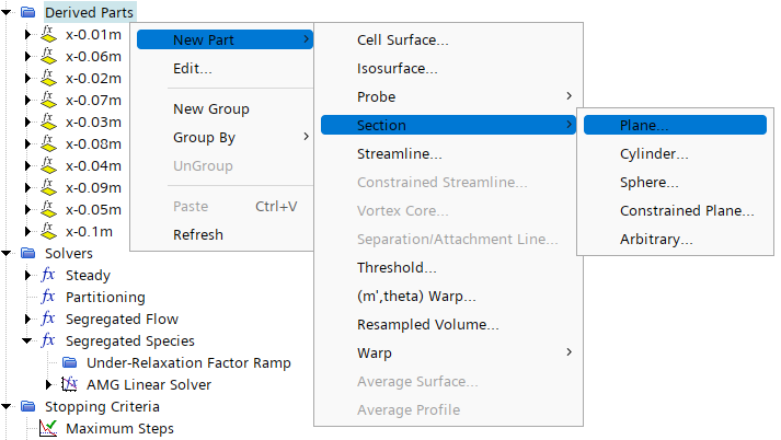 右键选择模型树节点 Derived Parts,点击弹出菜单New Part → Section → Plane… 打开设置面板